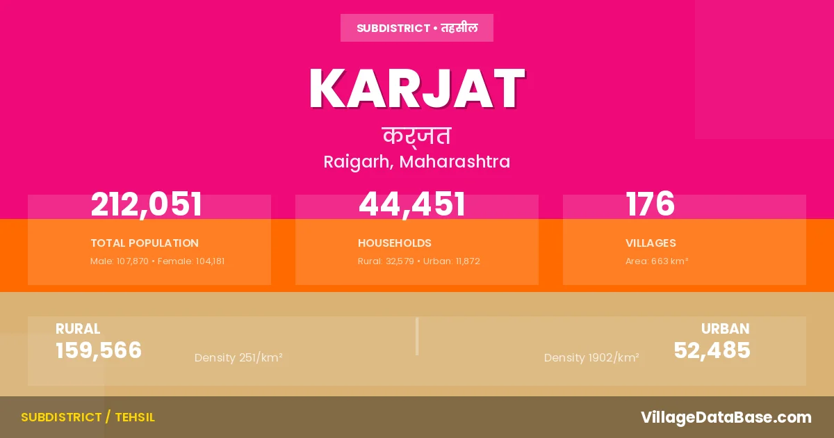 According to the 2011 census The total area of Karjat Tehsil is 663 km², with a population of 212051 people. The population density is 320 inhabitants per square kilometre, and there are approximately 44451 houses in the sub district.
