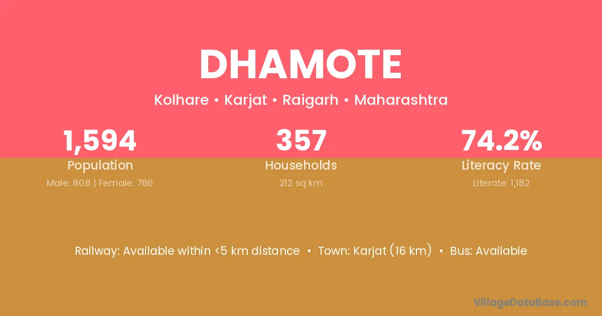 Karjat (16 km) is the nearest town to Dhamote village for major economic activities and is located approximately 16 km away.