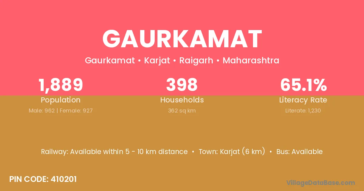 Karjat (6 km) is the nearest town to Gaurkamat village for major economic activities and is located approximately 6 km away.