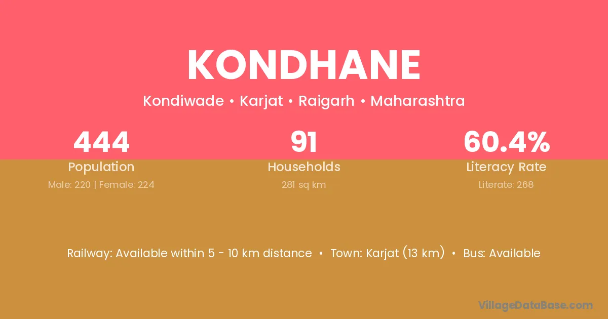 Kondhane village has a total population of 444 people, of which 220 are males and 224 are females.