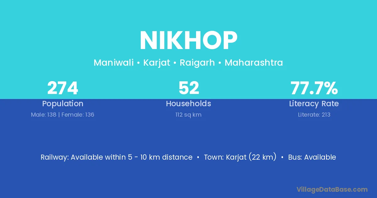 Karjat (22 km) is the nearest town to Nikhop village for major economic activities and is located approximately 22 km away.