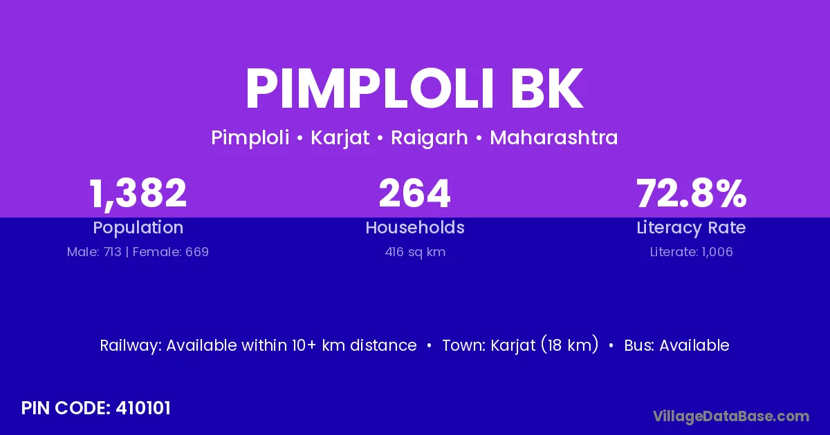 Karjat (18 km) is the nearest town to Pimploli Bk village for major economic activities and is located approximately 18 km away.
