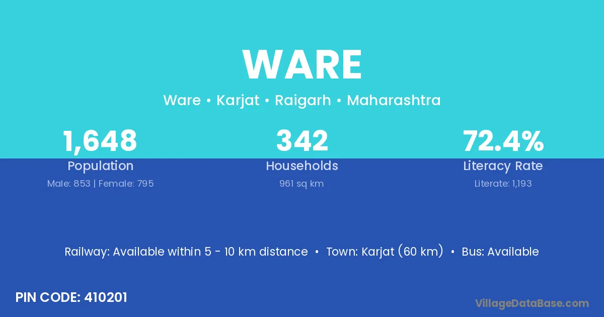 Karjat (60 km) is the nearest town to Ware village for major economic activities and is located approximately 60 km away.