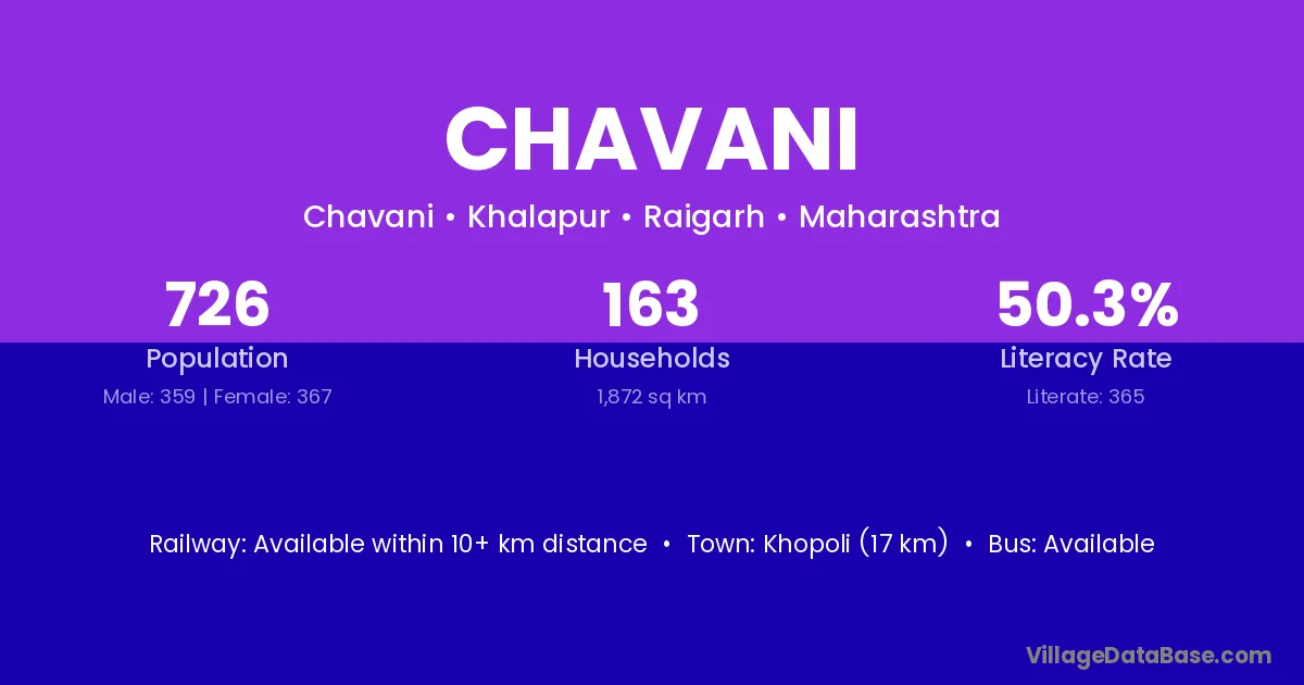 Khopoli (17 km) is the nearest town to Chavani village for major economic activities and is located approximately 17 km away.