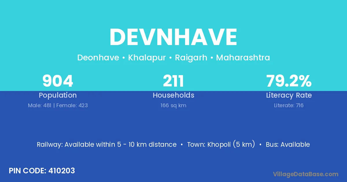 Khopoli (5 km) is the nearest town to Devnhave village for major economic activities and is located approximately 5 km away.