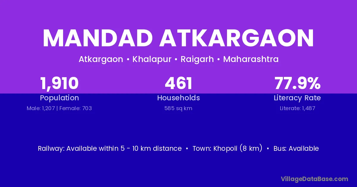 Khopoli (8 km) is the nearest town to Mandad Atkargaon village for major economic activities and is located approximately 8 km away.