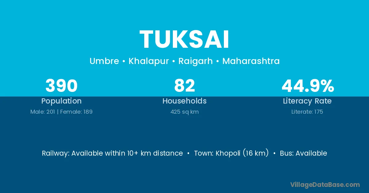 Khopoli (16 km) is the nearest town to Tuksai village for major economic activities and is located approximately 16 km away.