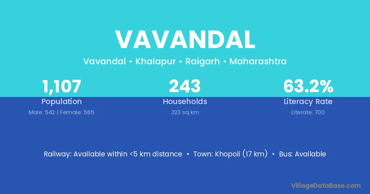 Khopoli (17 km) is the nearest town to Vavandal village for major economic activities and is located approximately 17 km away.