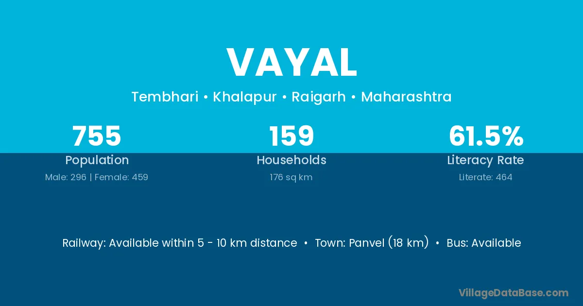 Panvel (18 km) is the nearest town to Vayal village for major economic activities and is located approximately 18 km away.