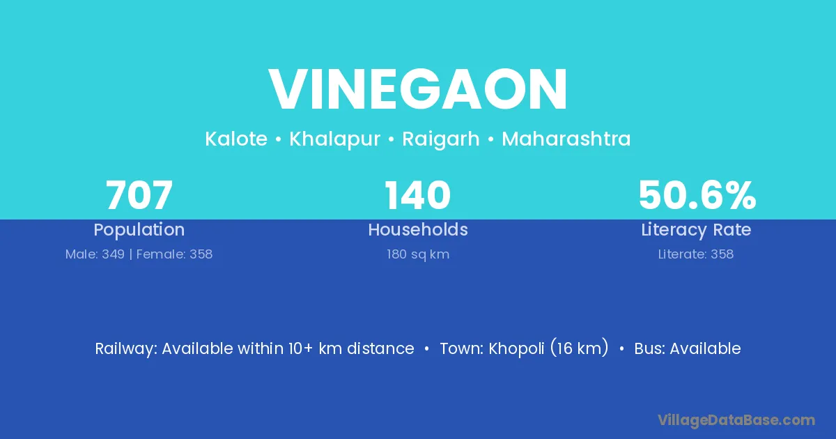 Vinegaon village has a total population of 707 people, of which 349 are males and 358 are females.