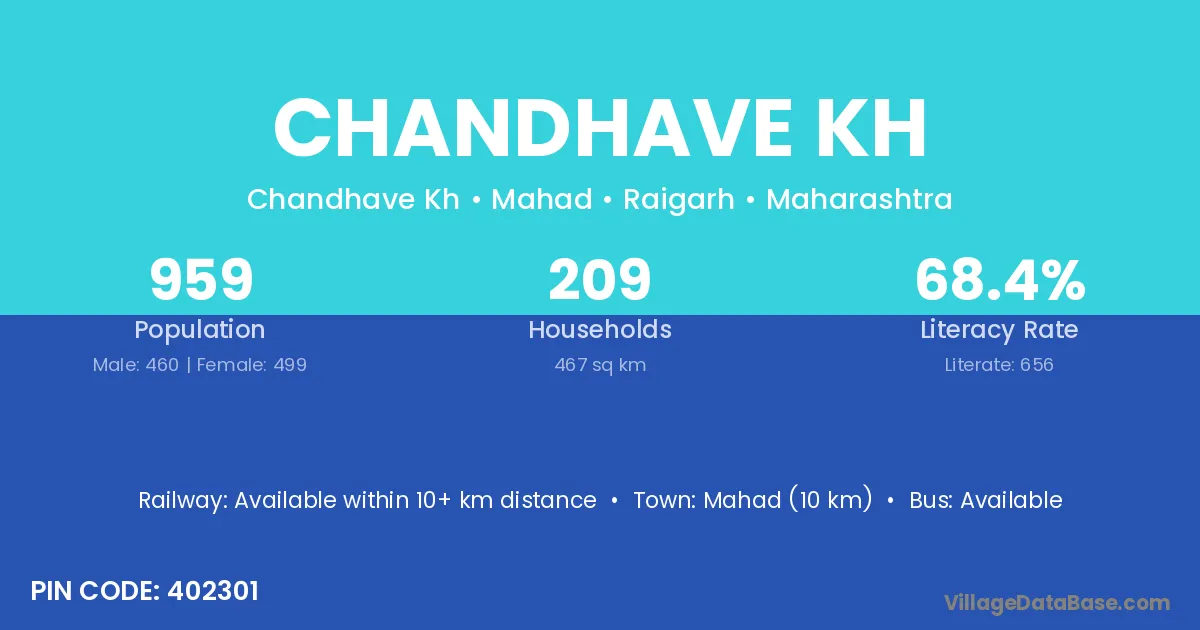 Mahad (10 km) is the nearest town to Chandhave Kh village for major economic activities and is located approximately 10 km away.