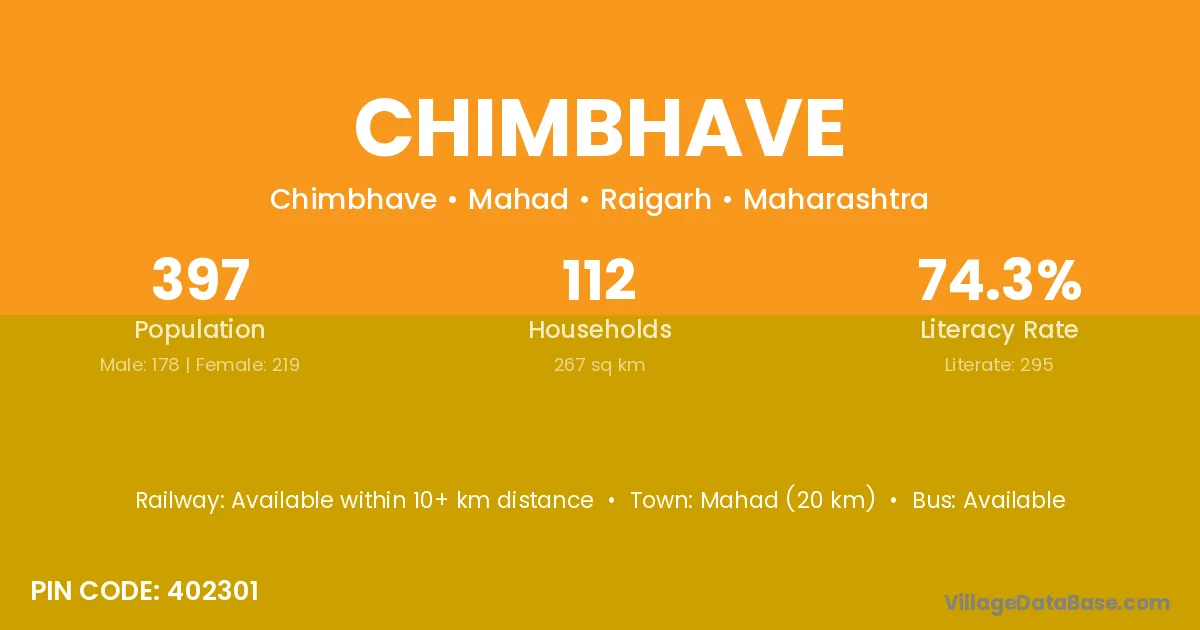 Mahad (20 km) is the nearest town to Chimbhave village for major economic activities and is located approximately 20 km away.