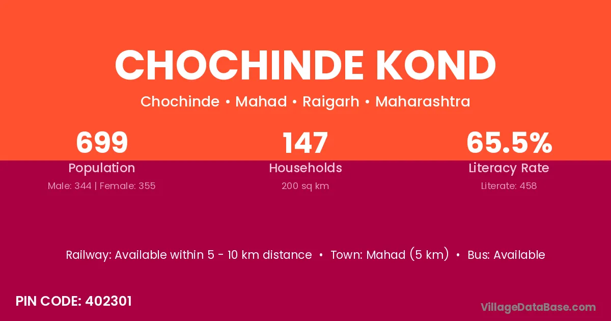 Mahad (5 km) is the nearest town to Chochinde Kond village for major economic activities and is located approximately 5 km away.