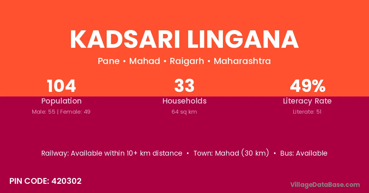 Mahad (30 km) is the nearest town to Kadsari Lingana village for major economic activities and is located approximately 30 km away.
