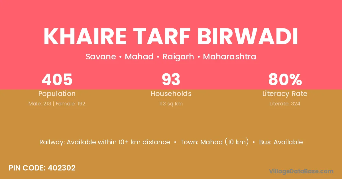 Mahad (10 km) is the nearest town to Khaire Tarf Birwadi village for major economic activities and is located approximately 10 km away.