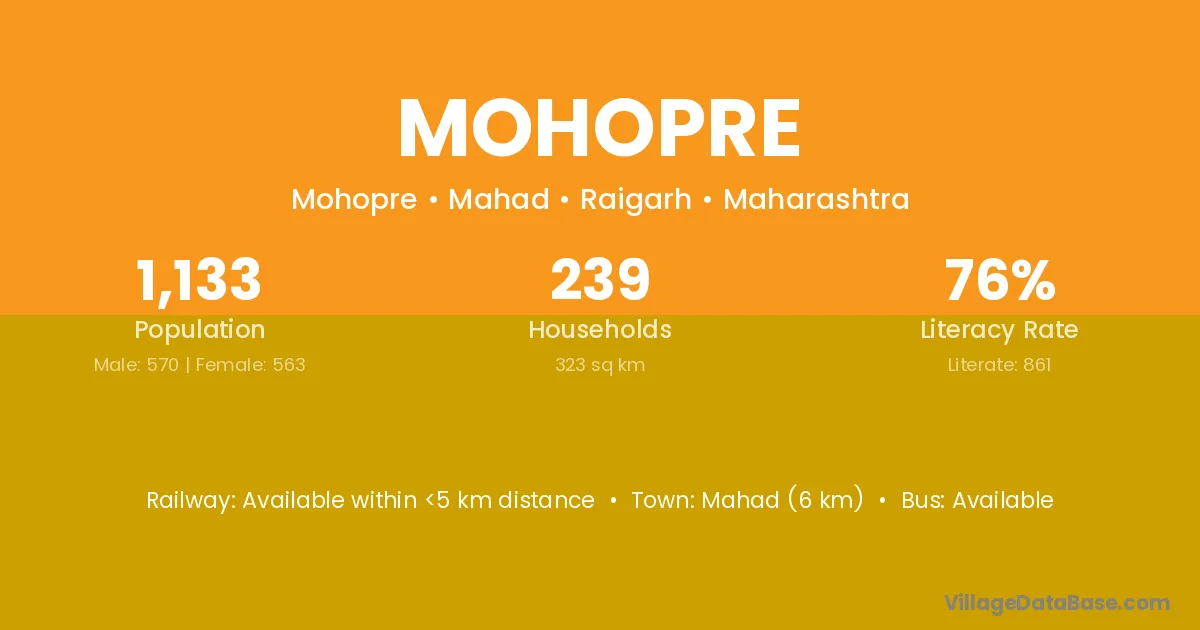 Mahad (6 km) is the nearest town to Mohopre village for major economic activities and is located approximately 6 km away.