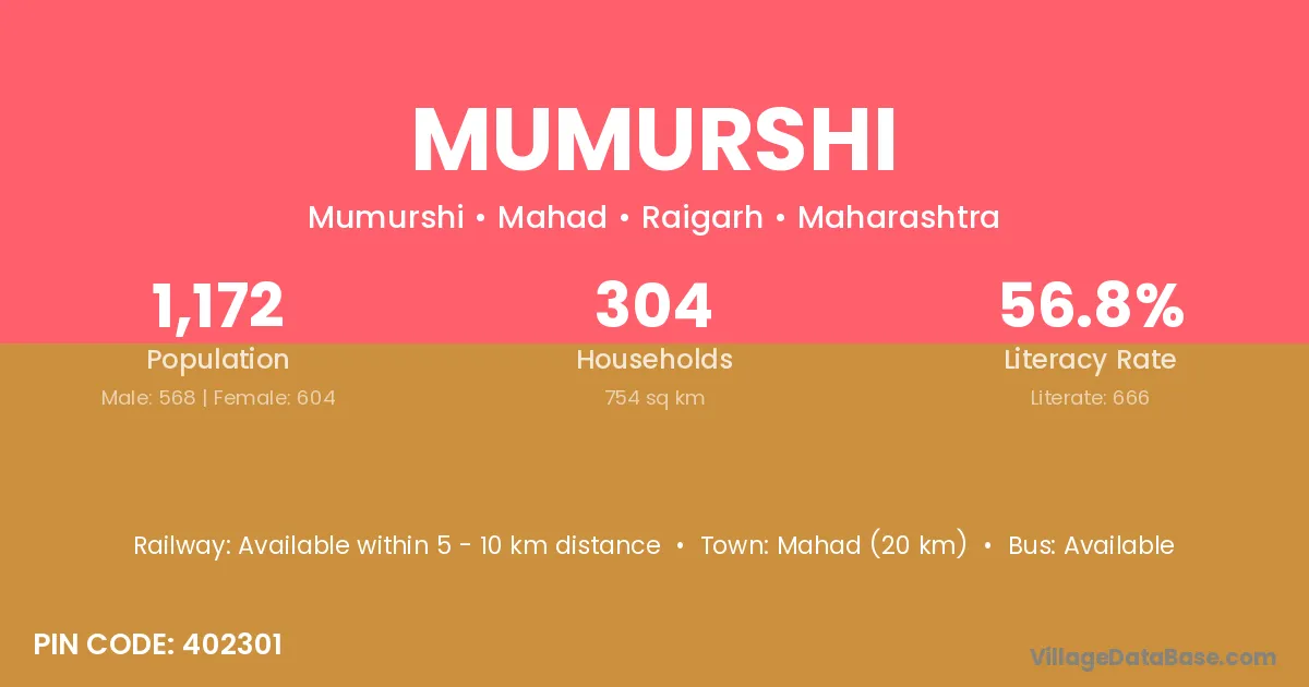 Mahad (20 km) is the nearest town to Mumurshi village for major economic activities and is located approximately 20 km away.
