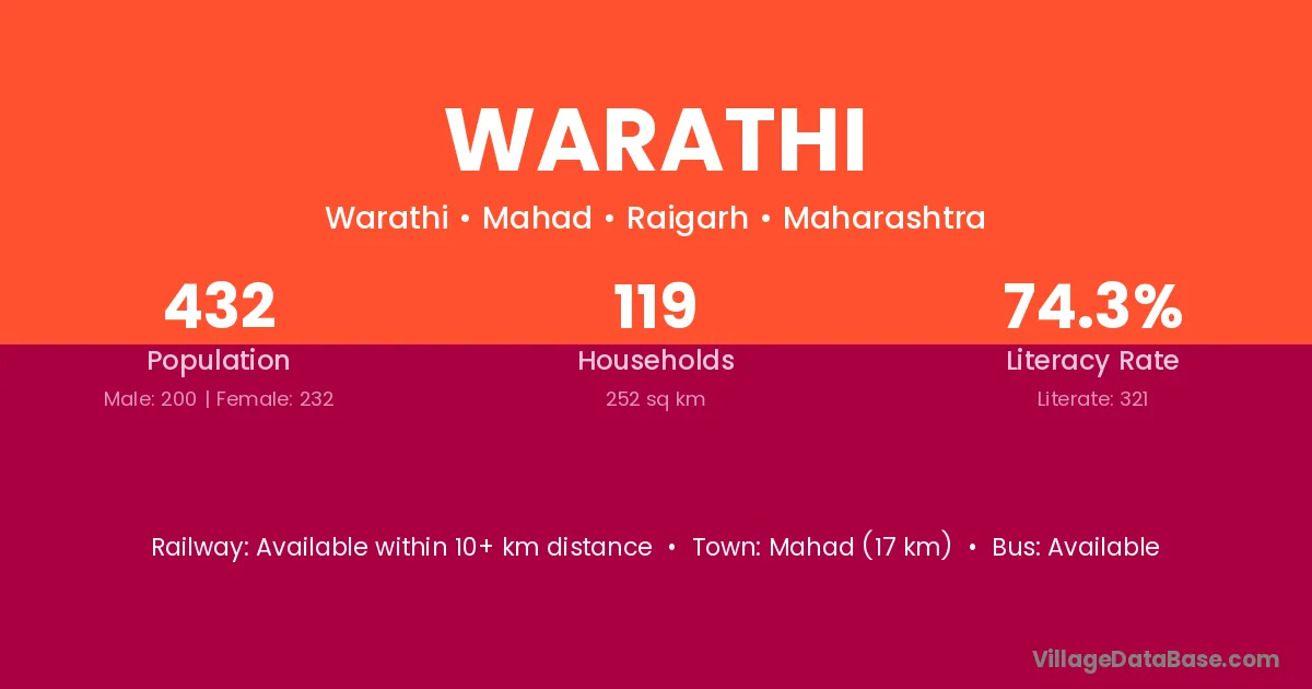 Mahad (17 km) is the nearest town to Warathi village for major economic activities and is located approximately 17 km away.