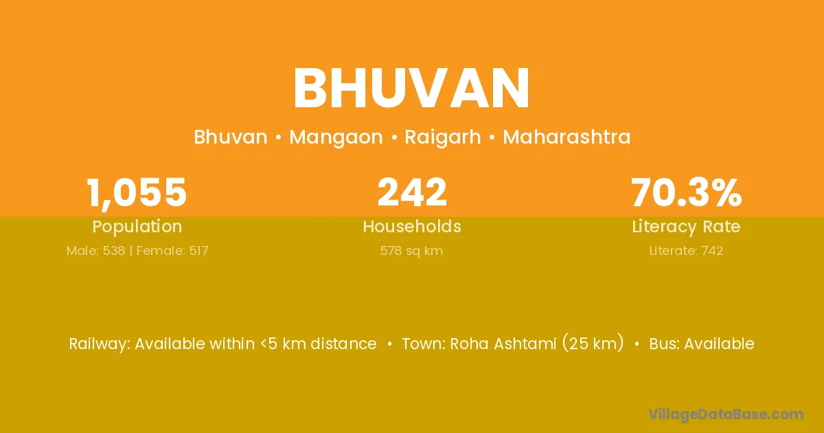 Roha Ashtami (25 km) is the nearest town to Bhuvan village for major economic activities and is located approximately 25 km away.