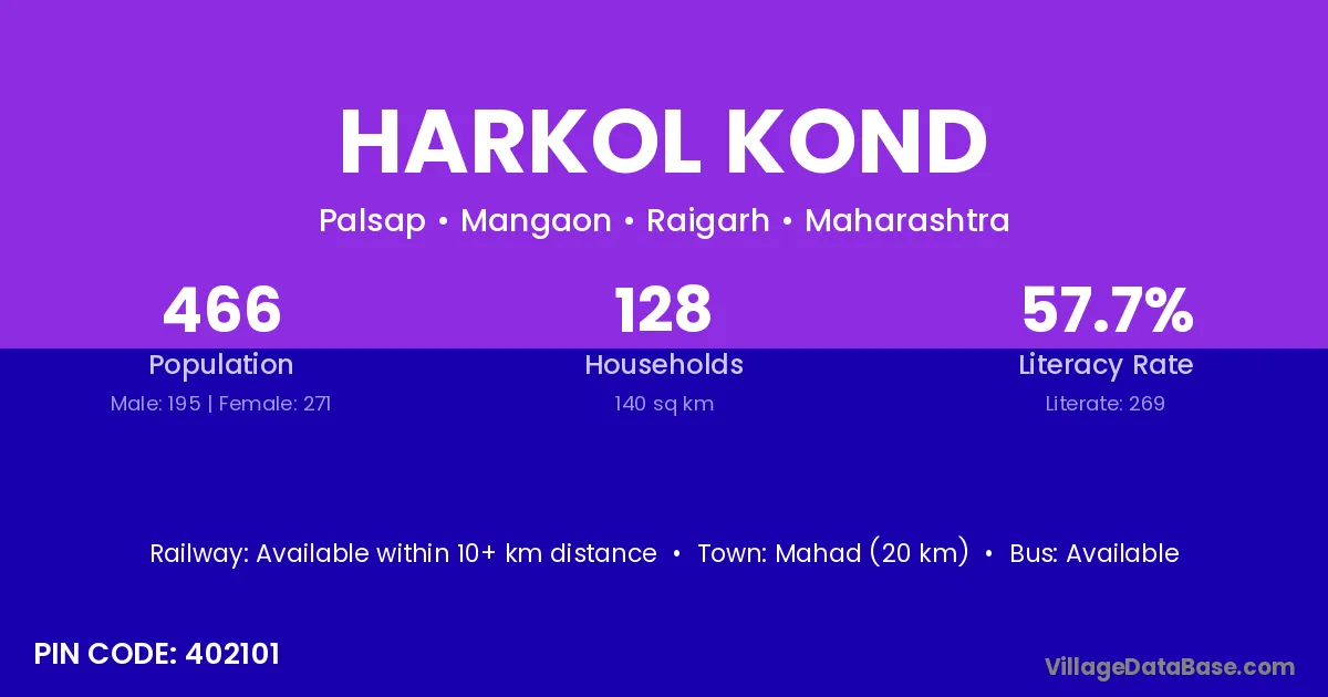 Mahad (20 km) is the nearest town to Harkol Kond village for major economic activities and is located approximately 20 km away.