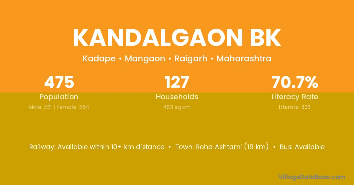 Kandalgaon Bk village has a total population of 475 people, of which 221 are males and 254 are females.