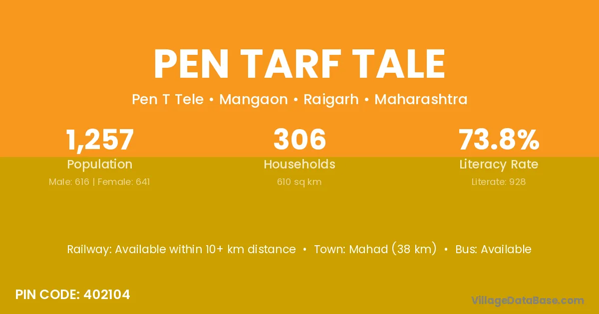 Mahad (38 km) is the nearest town to Pen Tarf Tale village for major economic activities and is located approximately 38 km away.