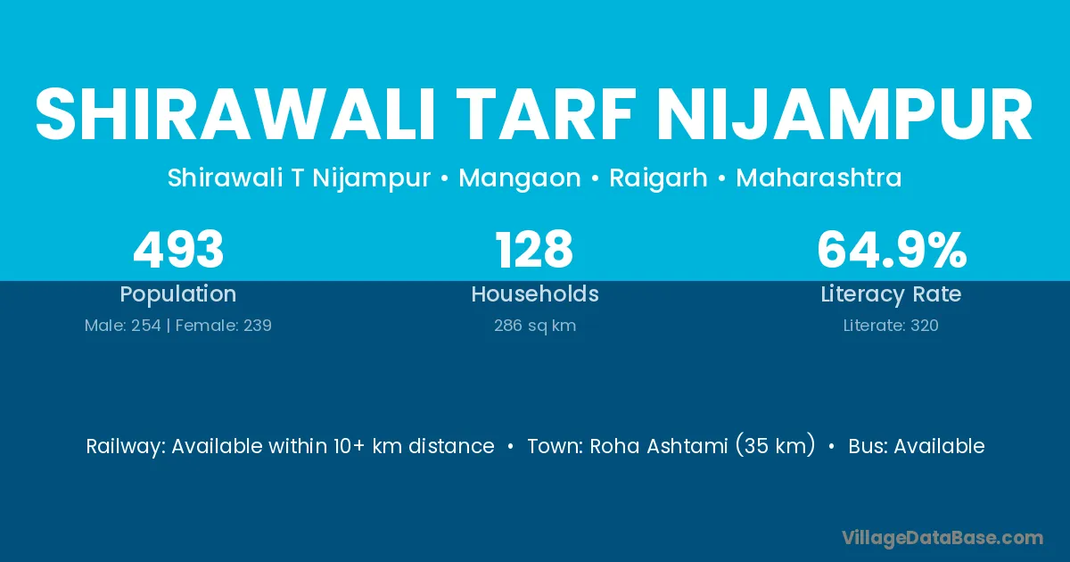 Roha Ashtami (35 km) is the nearest town to Shirawali Tarf Nijampur village for major economic activities and is located approximately 35 km away.