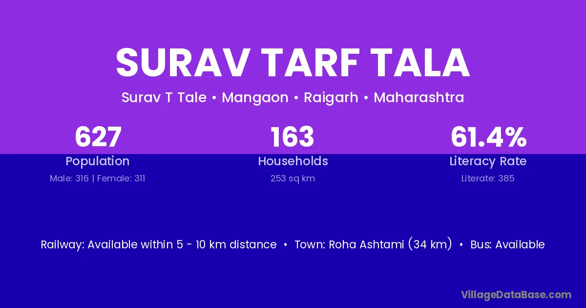 Roha Ashtami (34 km) is the nearest town to Surav Tarf Tala village for major economic activities and is located approximately 34 km away.