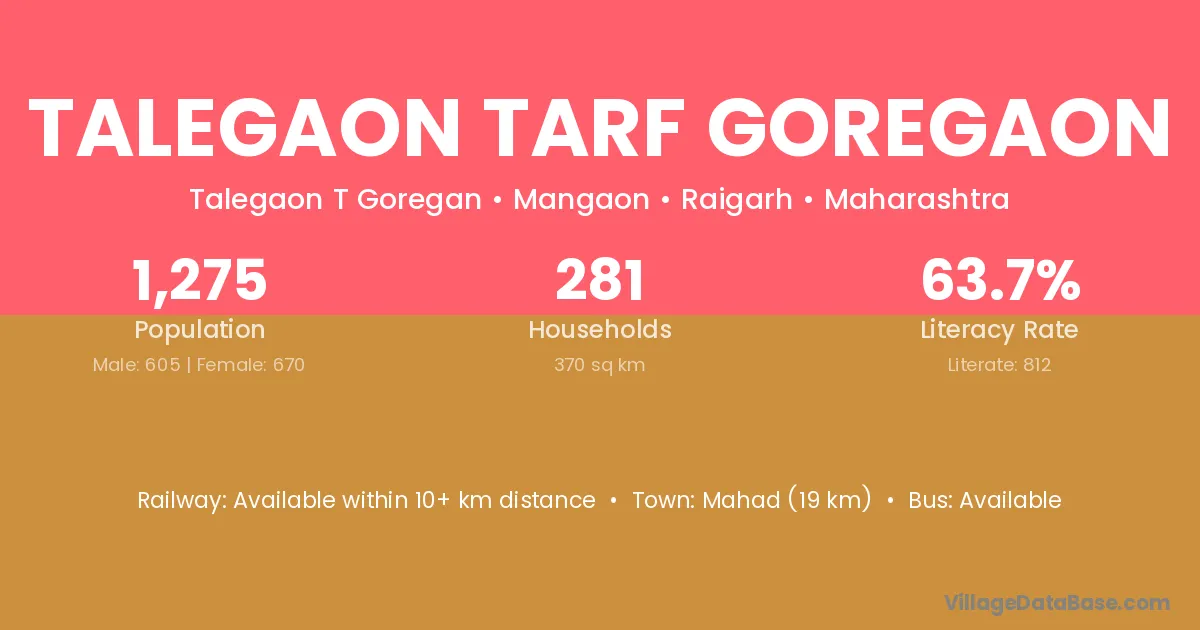 Talegaon Tarf Goregaon village has a total population of 1,275 people, of which 605 are males and 670 are females.