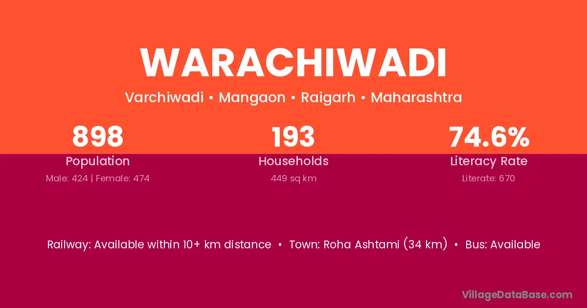 Roha Ashtami (34 km) is the nearest town to Warachiwadi village for major economic activities and is located approximately 34 km away.