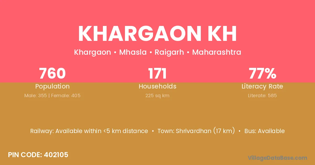 Shrivardhan (17 km) is the nearest town to Khargaon Kh village for major economic activities and is located approximately 17 km away.