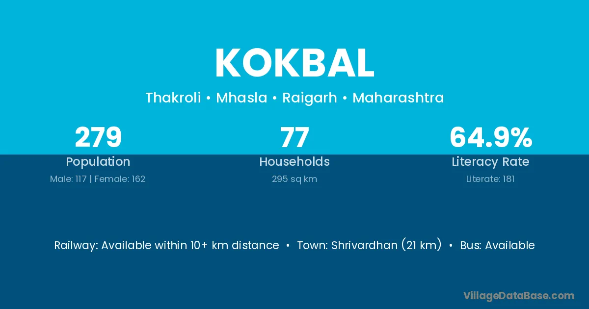 Shrivardhan (21 km) is the nearest town to Kokbal village for major economic activities and is located approximately 21 km away.