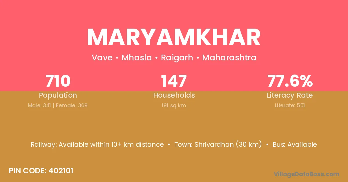 Shrivardhan (30 km) is the nearest town to Maryamkhar village for major economic activities and is located approximately 30 km away.