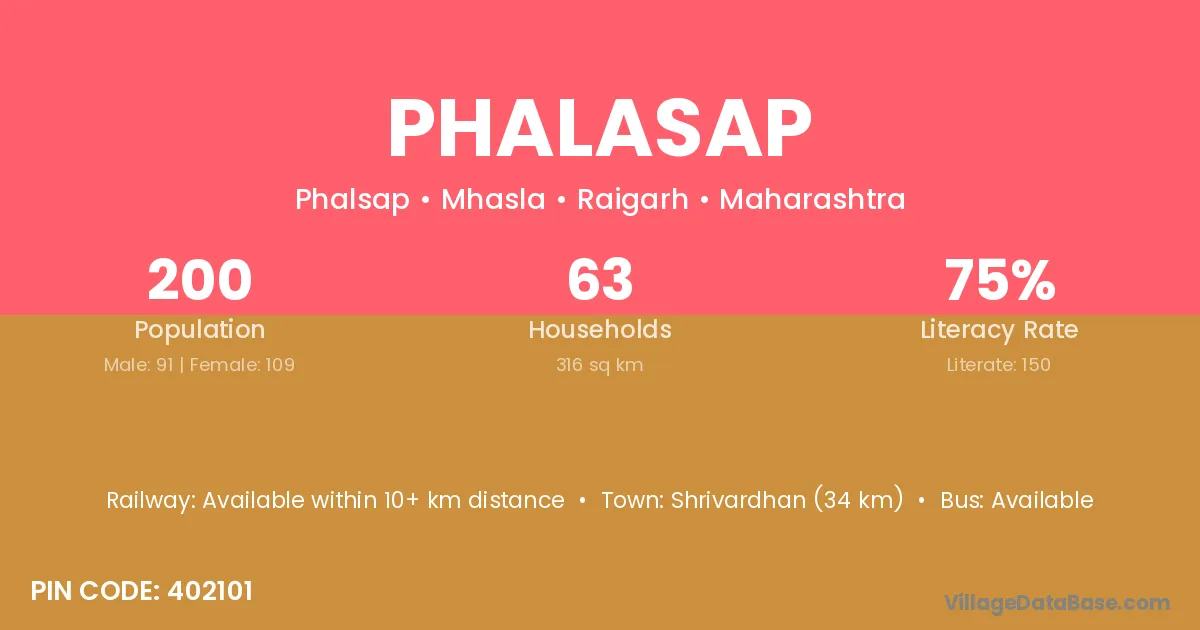 Shrivardhan (34 km) is the nearest town to Phalasap village for major economic activities and is located approximately 34 km away.
