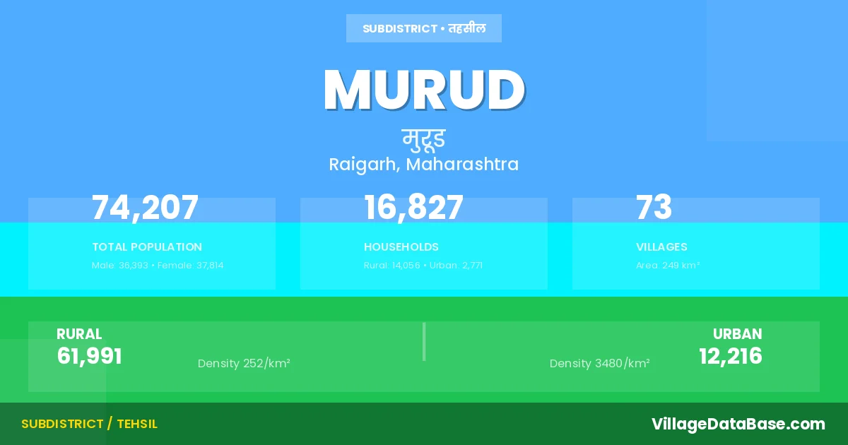According to the 2011 census The total area of Murud Tehsil is 249 km², with a population of 74207 people. The population density is 298 inhabitants per square kilometre, and there are approximately 16827 houses in the sub district.