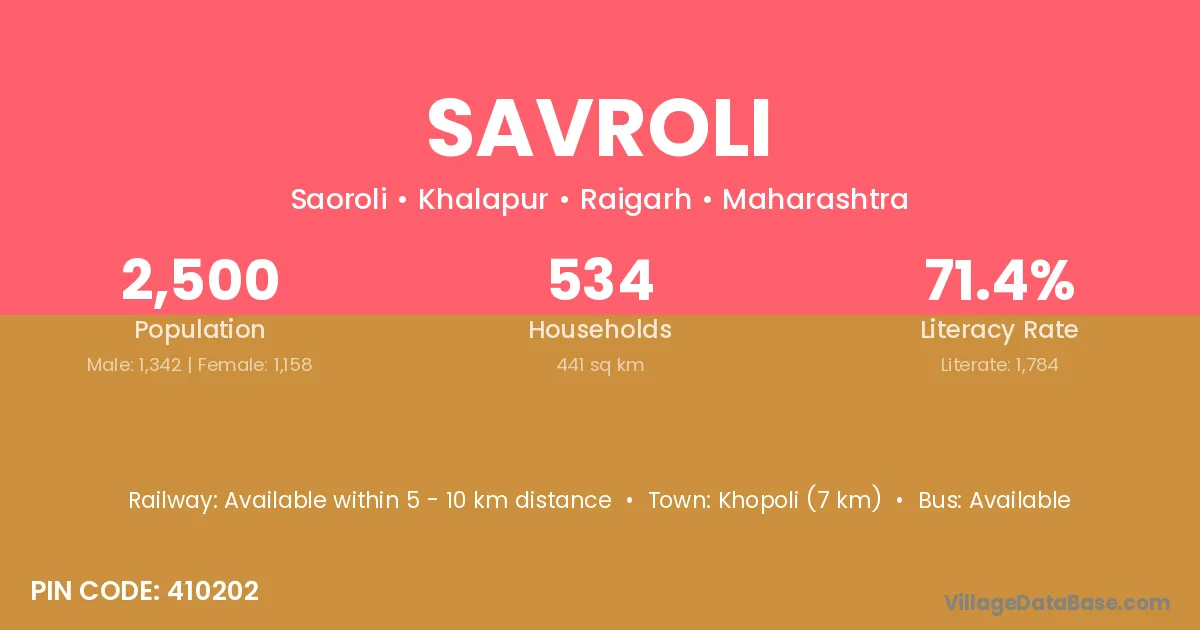 Roha Ashtami (23 km) is the nearest town to Savroli village for major economic activities and is located approximately 23 km away.