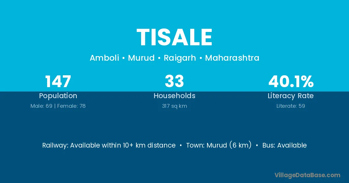 Murud (6 km) is the nearest town to Tisale village for major economic activities and is located approximately 6 km away.