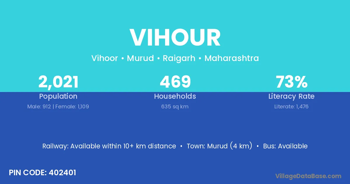 Murud (4 km) is the nearest town to Vihour village for major economic activities and is located approximately 4 km away.