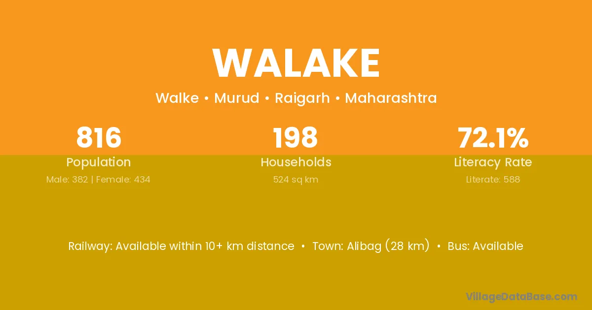 Alibag (28 km) is the nearest town to Walake village for major economic activities and is located approximately 28 km away.