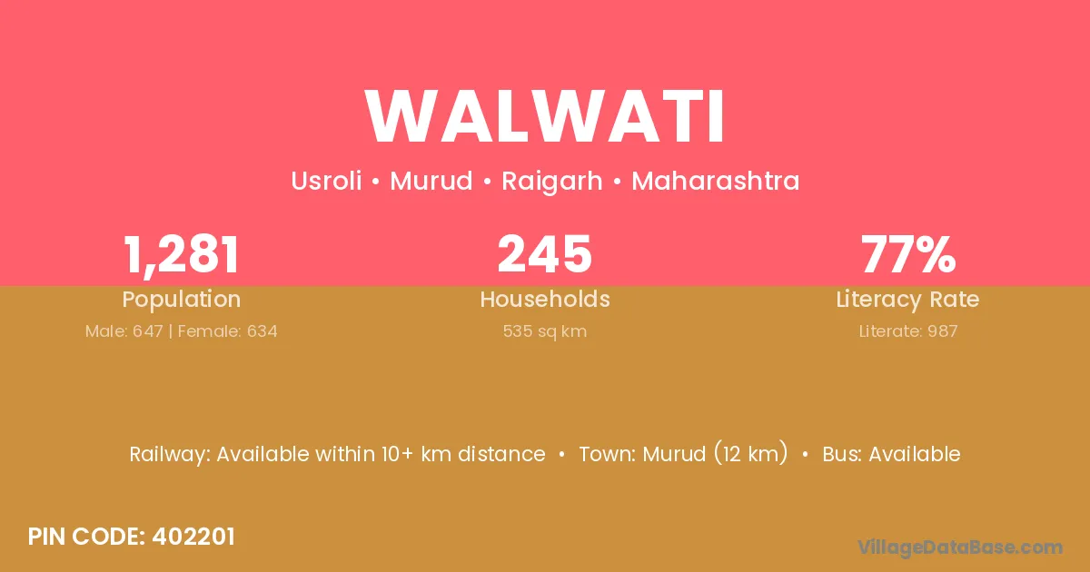 Murud (12 km) is the nearest town to Walwati village for major economic activities and is located approximately 12 km away.