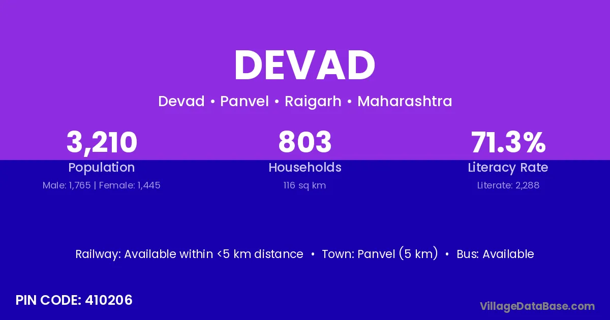 Panvel (5 km) is the nearest town to Devad village for major economic activities and is located approximately 5 km away.