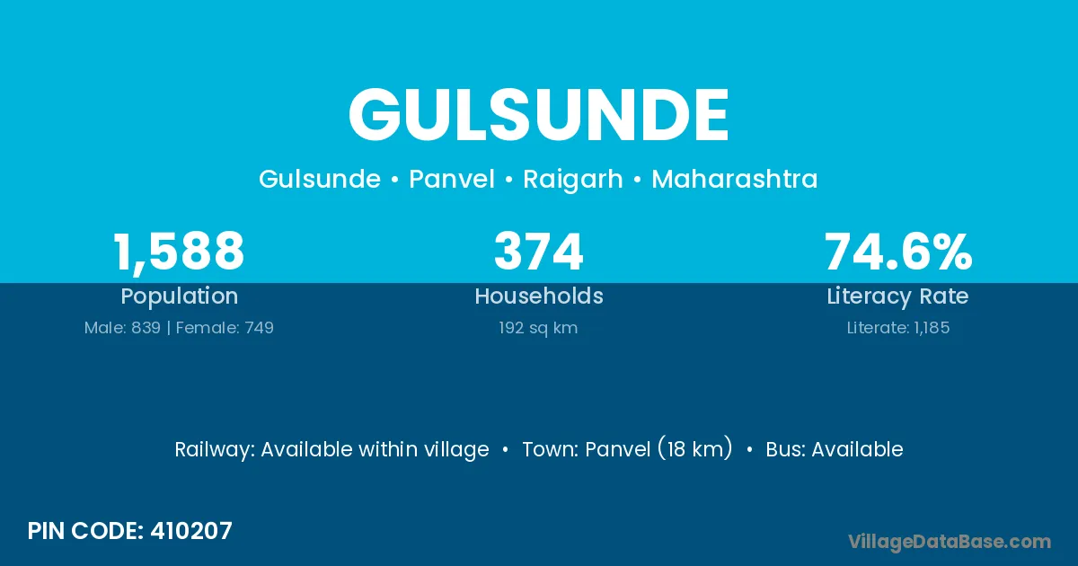 Panvel (18 km) is the nearest town to Gulsunde village for major economic activities and is located approximately 18 km away.