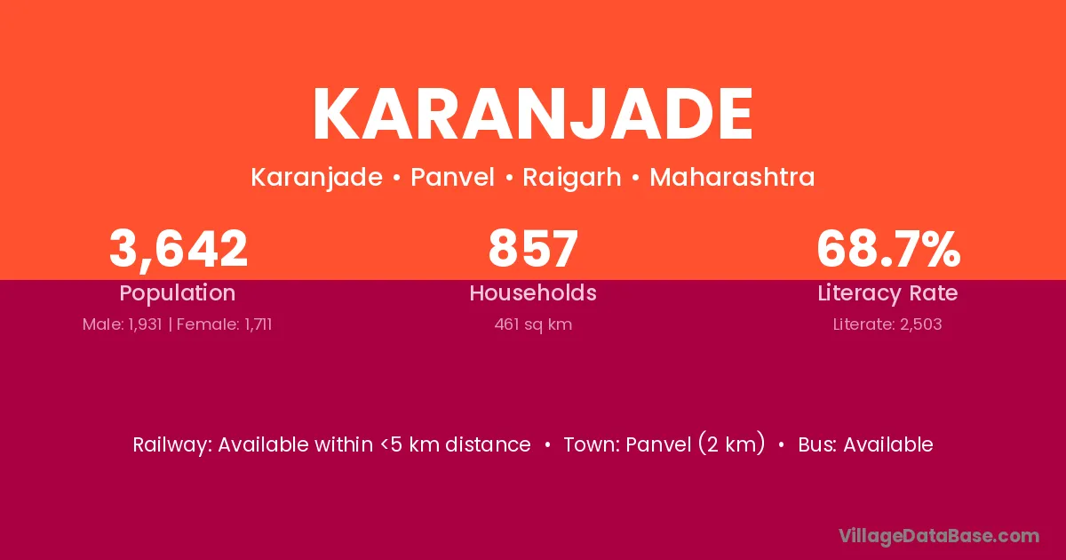 Karanjade village has a total population of 3,642 people, of which 1,931 are males and 1,711 are females.