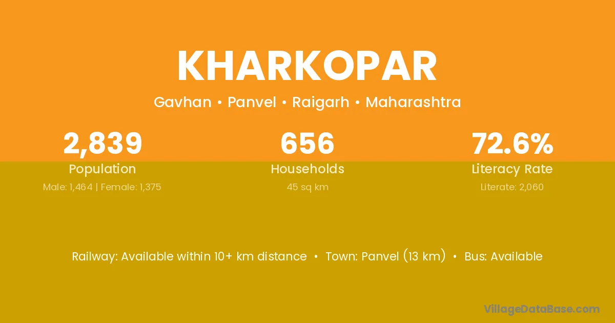 Panvel (13 km) is the nearest town to Kharkopar village for major economic activities and is located approximately 13 km away.