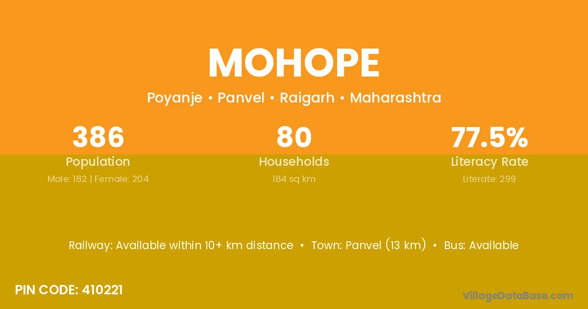 Panvel (13 km) is the nearest town to Mohope village for major economic activities and is located approximately 13 km away.