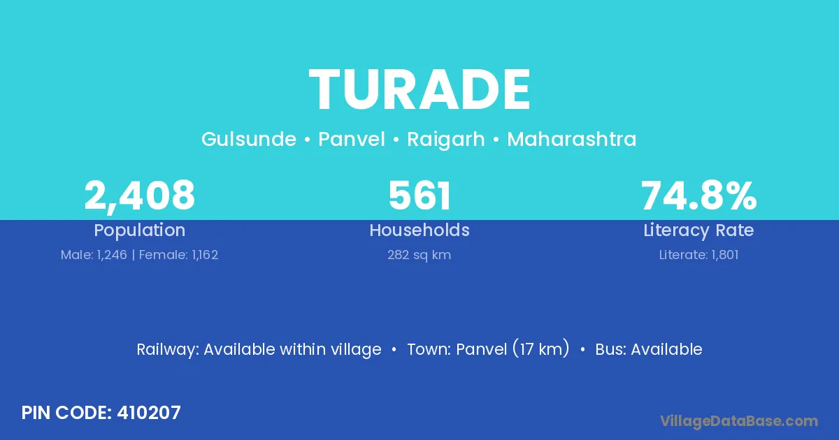 Panvel (17 km) is the nearest town to Turade village for major economic activities and is located approximately 17 km away.