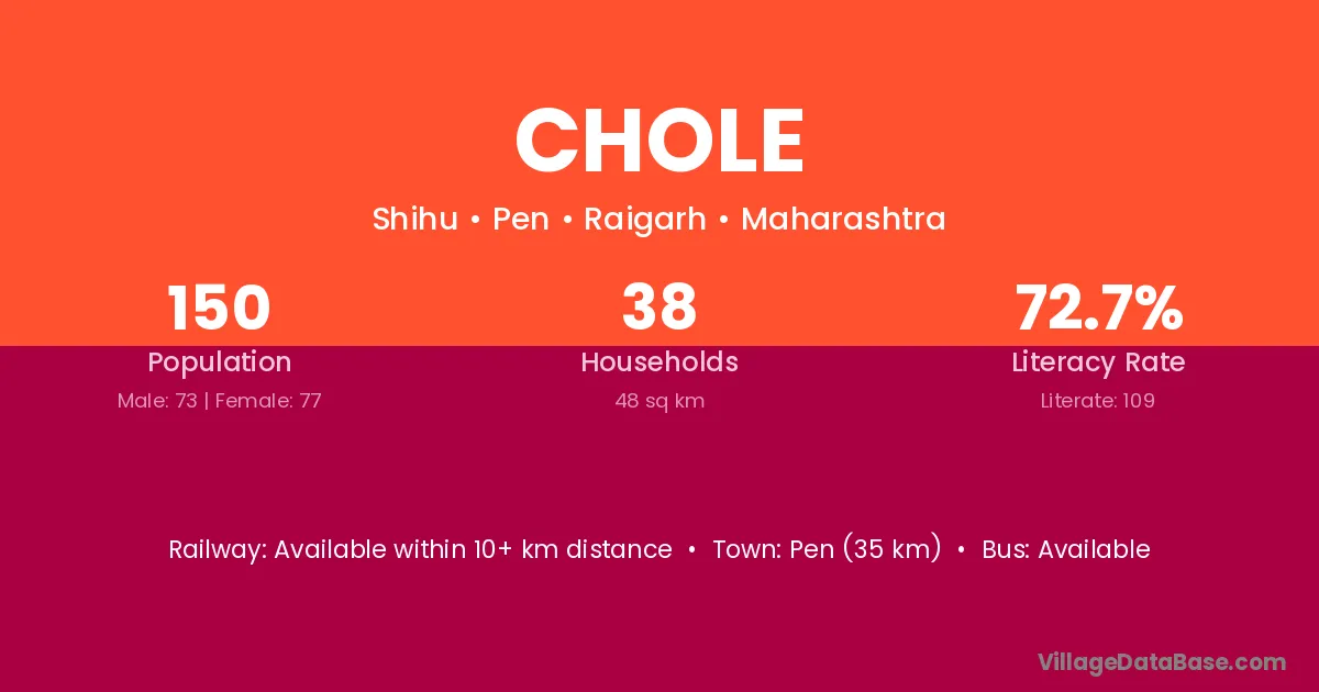 Pen (35 km) is the nearest town to Chole village for major economic activities and is located approximately 35 km away.