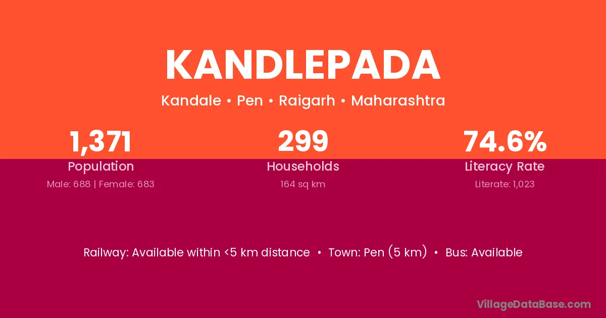 Kandlepada village has a total population of 1,371 people, of which 688 are males and 683 are females.