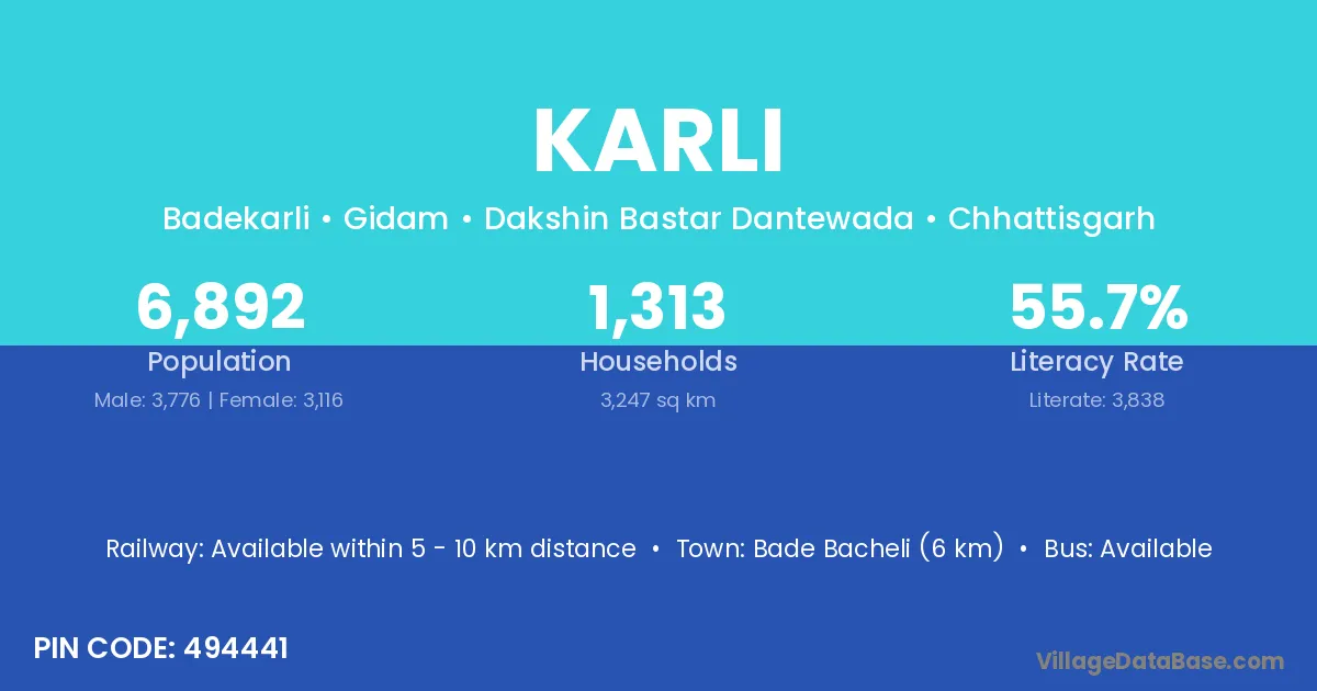 The literacy rate of Karli village is 52.08%. Male literacy stands at 59.58% and female literacy at 44.58%.