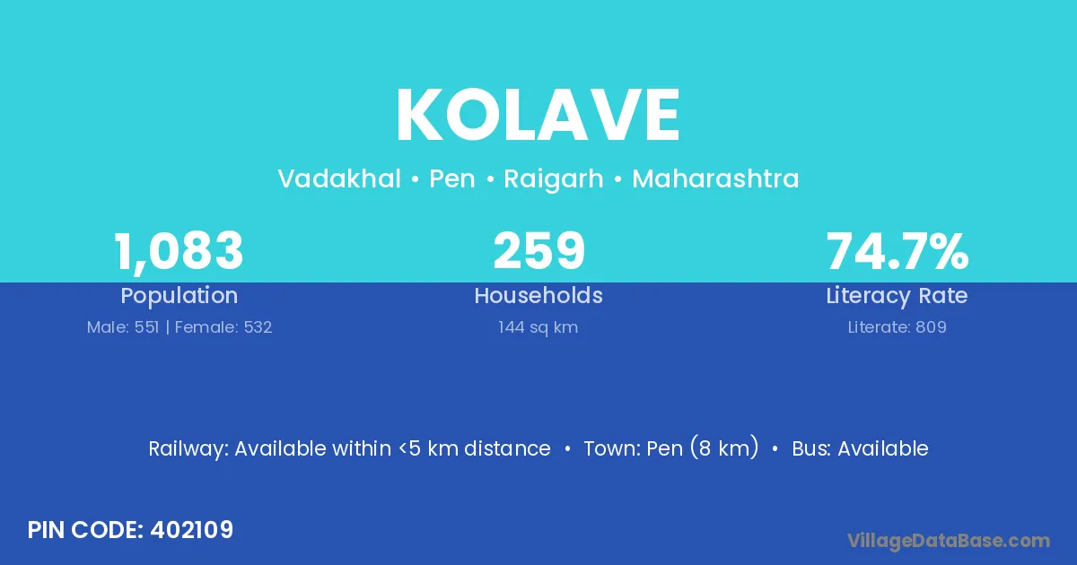 Pen (8 km) is the nearest town to Kolave village for major economic activities and is located approximately 8 km away.